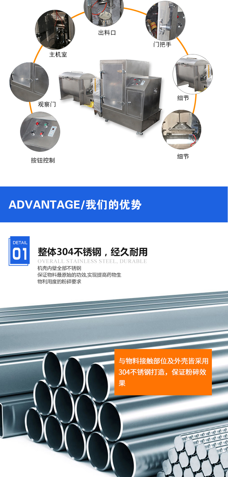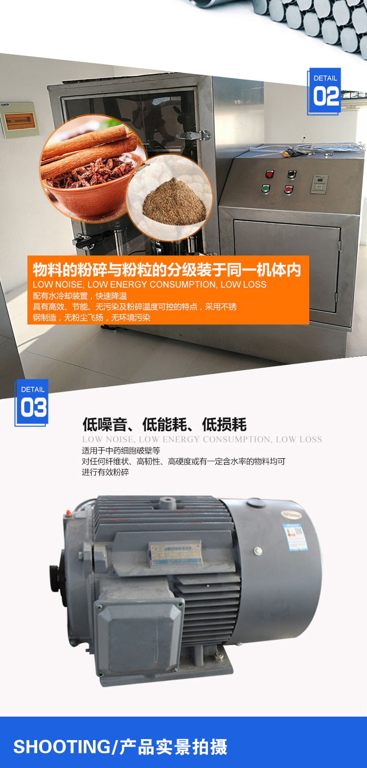 本機對任何纖維狀、高韌性、高硬度或有一定含水率的物料均可進行有效粉碎,特別適用于中藥細胞破壁等旨在提高藥物生物利用度的粉碎要求及用常規(guī)方法無法達到要求細度的物料。