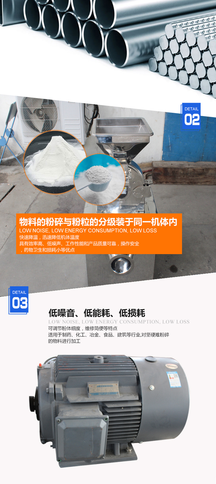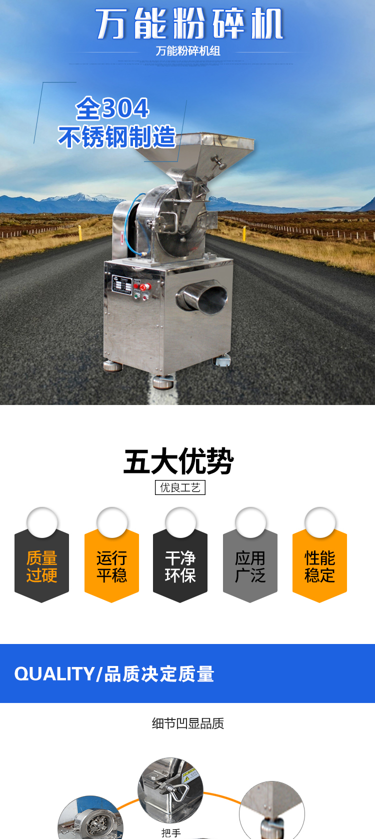 萬(wàn)能粉碎機(jī)適用于制藥、化工、冶金、食品、建筑等行業(yè)。對(duì)堅(jiān)硬難粉碎的物料進(jìn)行加工,包括對(duì)塑料、銅絲、中草藥、橡膠等進(jìn)行粉碎,也能作為微粉碎機(jī)、超微粉碎機(jī)加工前道工序的配套設(shè)備。它集粉室采用全封閉消音結(jié)構(gòu),可有效地減低工作噪音。機(jī)器中裝存降溫裝置,使機(jī)溫降低,工作更為平穩(wěn),本機(jī)電機(jī)轉(zhuǎn)速5000轉(zhuǎn)/分。本機(jī)采用Icr18Ni9Ti不銹鋼材料制造,具有較強(qiáng)的耐磨耐腐蝕特點(diǎn),適合加工高級(jí)和有腐蝕性物料。本機(jī)采用沖擊式破碎方法,物料進(jìn)入粉碎室后,受到高速回轉(zhuǎn)的六只活動(dòng)錘體沖擊,經(jīng)齒圈和物料相互撞擊而粉碎,被粉碎的物料在氣流的幫助下,通過(guò)篩孔進(jìn)入盛粉袋,不留殘?jiān)?。具有效率高、低噪聲、工作性能和產(chǎn)品質(zhì)量可靠,操作安全,藥物衛(wèi)生和損耗小等優(yōu)點(diǎn)。