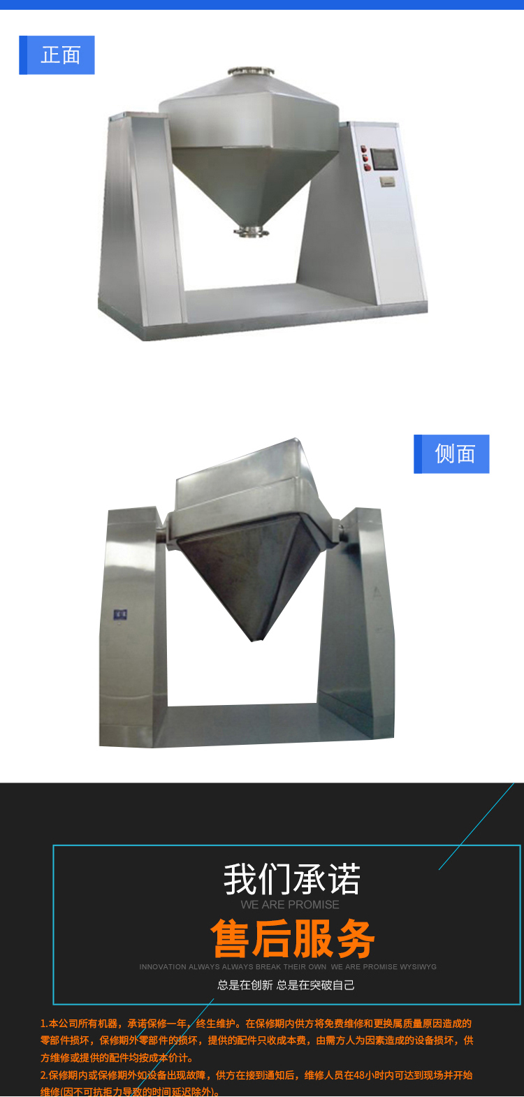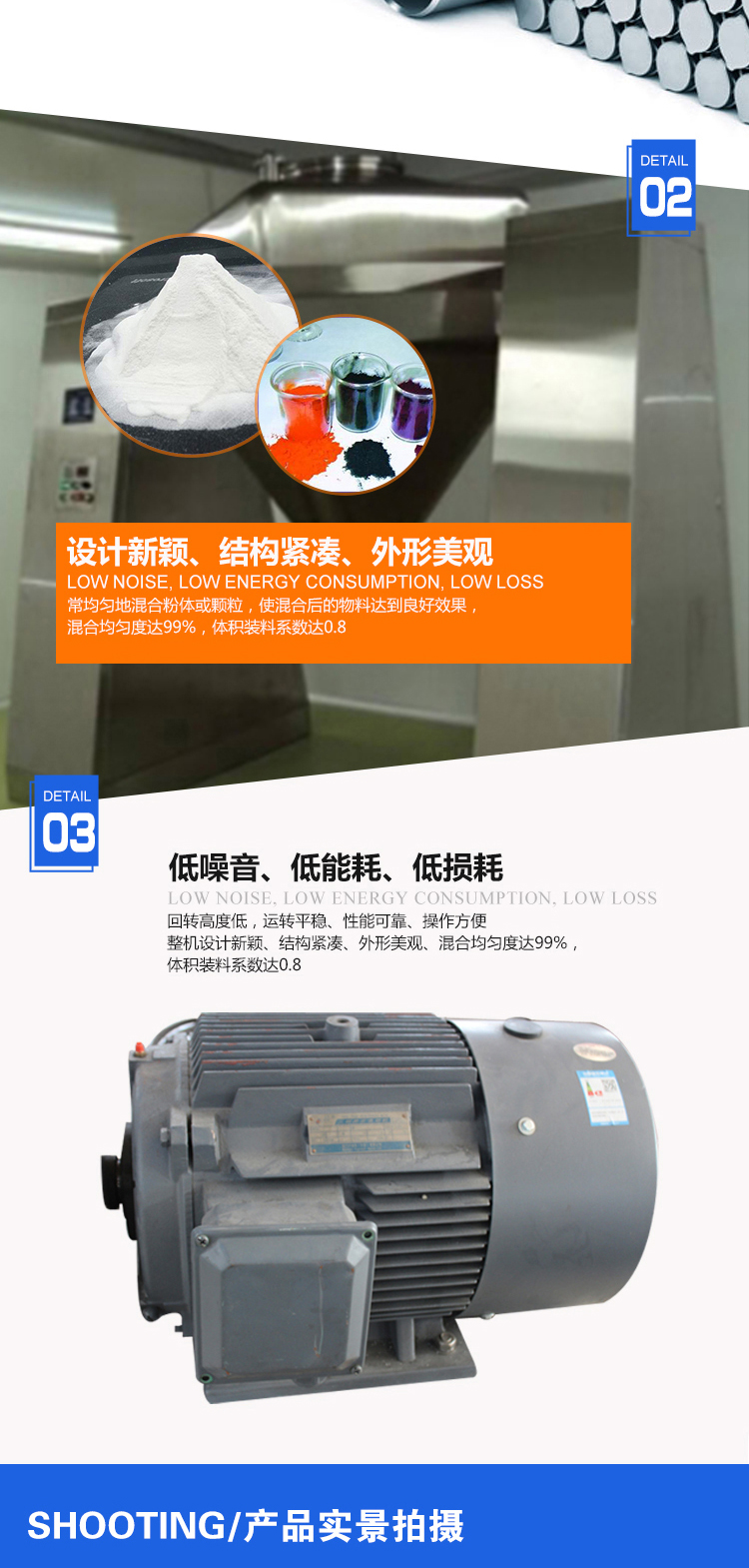 1、 整機(jī)設(shè)計新穎、結(jié)構(gòu)緊湊、外形美觀、混合均勻度達(dá)99%,體積裝料系數(shù)達(dá)0.8。
