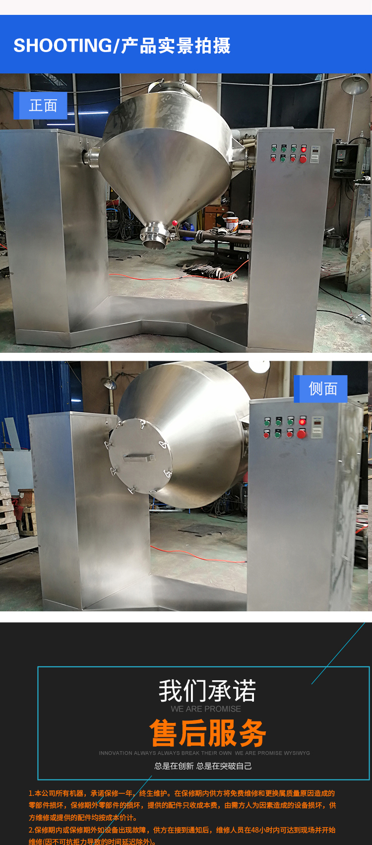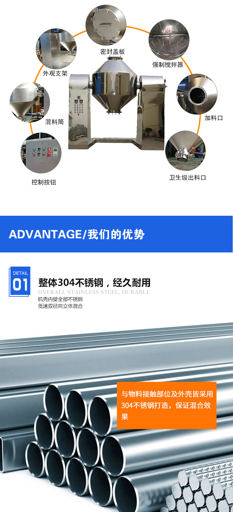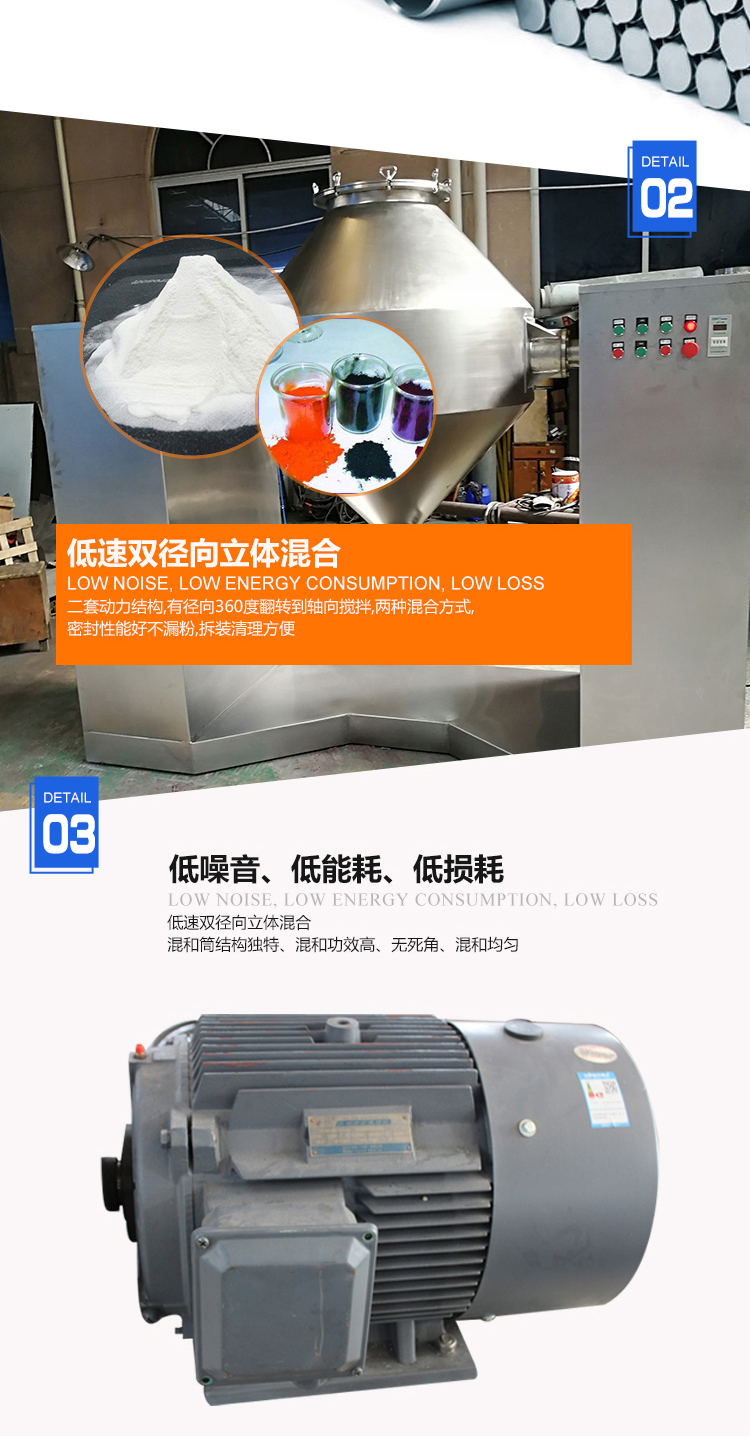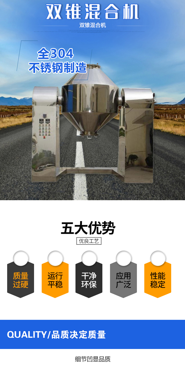 該機(jī)由于是低速雙徑向立體混合,因此不但適用于各行各業(yè)的普通物料混合,還適用于含油多,含糖多,易燃易爆,升溫固化或轉(zhuǎn)化物料的混合(如:藥物,食品添加劑,化工助劑,紡織漿料等).尤其對(duì)粉末涂料來說,既適用于成品粉后混合,特別是花紋,雙色粉,金屬粉等特殊粉的后混后以及回收粉,超細(xì)粉的后混合成品粉均混,產(chǎn)品混+疏松劑(三氧化鋁)后混合,也可用于大容量粉末涂料預(yù)混合.還適用于食品、藥品、農(nóng)藥、氧化鋅、洗滌劑、獸藥、復(fù)合肥、飼料、石油、冶金礦山、建材工業(yè)、涂料、染料、顏料、助劑、碳酸鈣、生物、陶瓷、化工、香精香料、雞精、調(diào)味品、茶葉、糧食類、淀粉、植物纖維、奶粉、可可粉、面粉、咖啡、葡萄糖等行業(yè)使用。本機(jī)不銹鋼筒體厚,因而保證了筒體不變形,攪龍現(xiàn)改為兩端不銹鋼法蘭連接,同心度好不變形保證兩端加大密封和拆卸方便.下筒體錐厚加大,出料口采用大口徑不銹鋼蝶閥,從而保證出料快不支空.