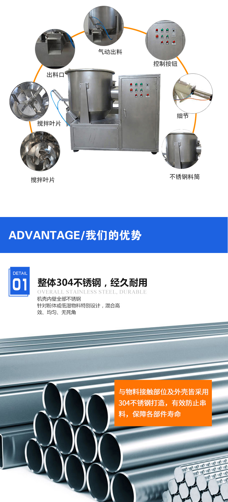 5、該機(jī)物料接觸部位均采用不銹鋼制作,混合過程中不會(huì)產(chǎn)生物料揮發(fā)、變質(zhì)或流失等現(xiàn)象,保障了工藝配比要求;