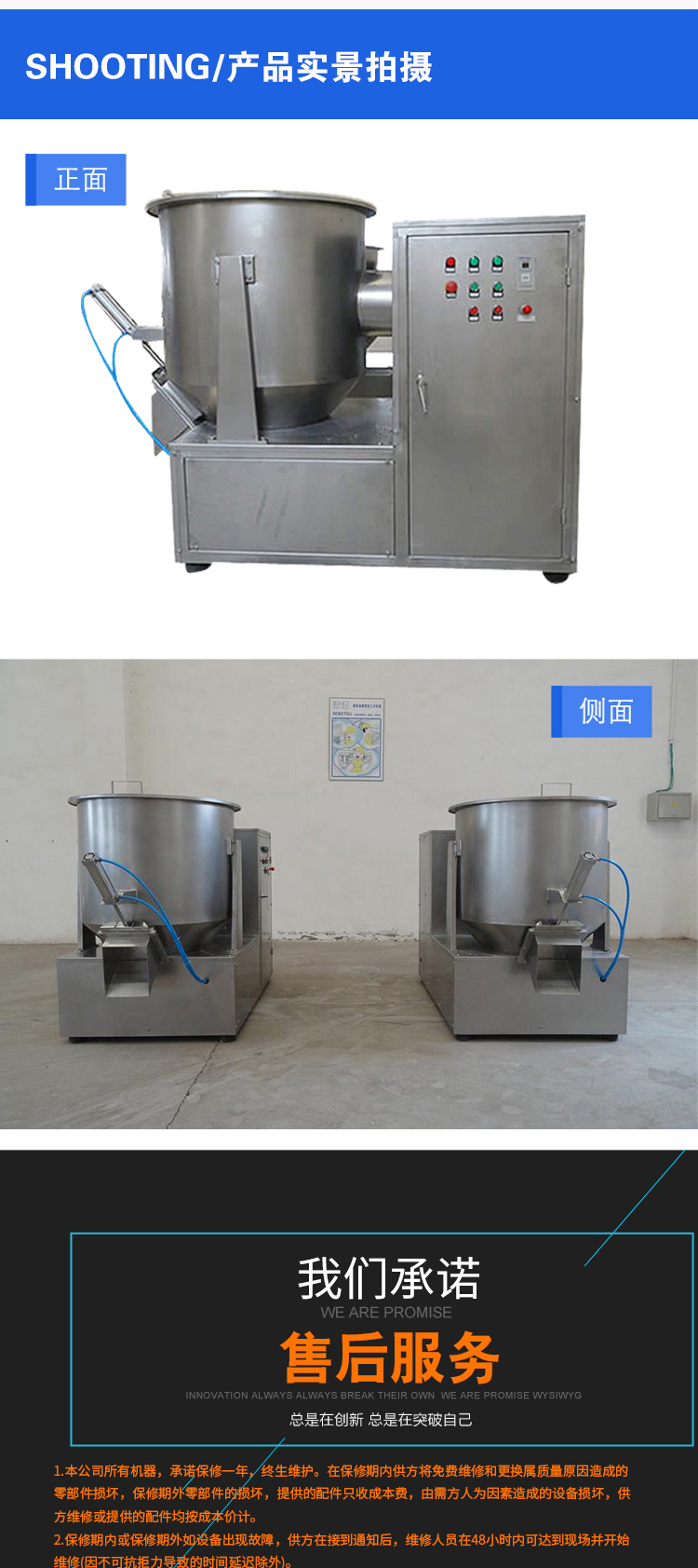 6、該機(jī)適用于不同比例的干、濕物料的混合,特別適用于雞精、藥品沖劑、飲料沖劑等多種復(fù)雜物料的混合攪拌。