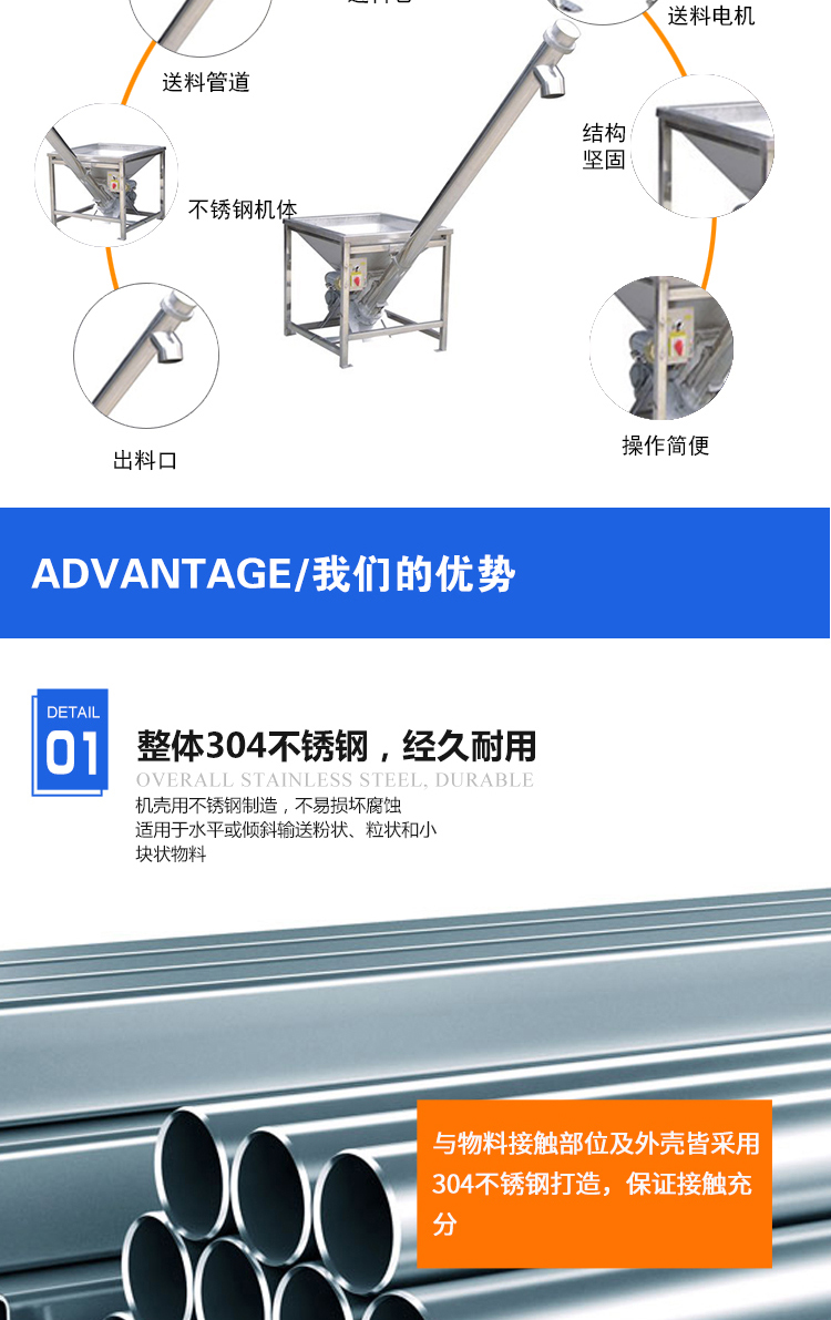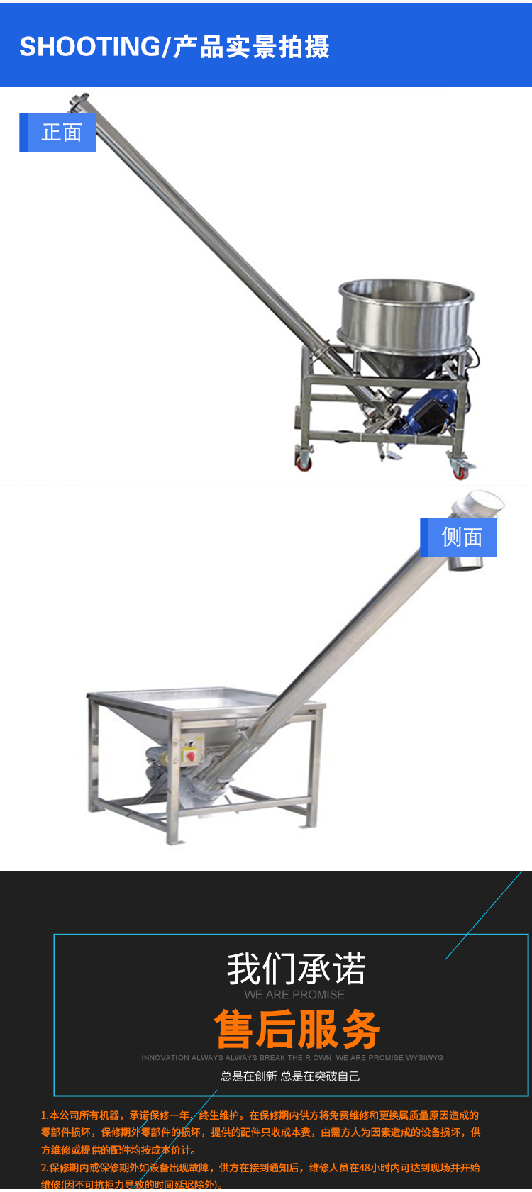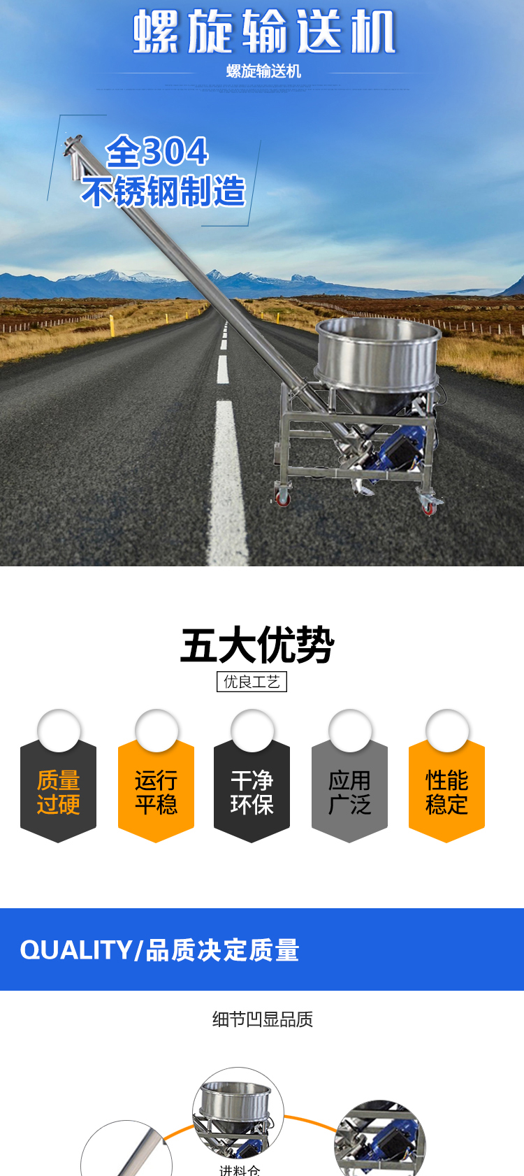 此類螺旋輸送機可以根據(jù)客戶不同生產(chǎn)情況和生產(chǎn)目的來定制。生產(chǎn)材料可以為全碳鋼,部分不銹鋼,以及全不銹鋼為主。對食品衛(wèi)生有要求的企業(yè)推薦主材不銹鋼,無要求可以采用碳鋼。