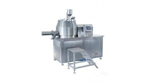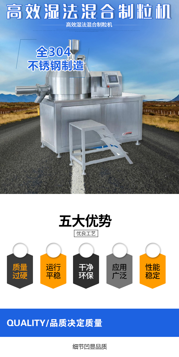 粉粒物料與粘合劑在圓筒形容器中由底部混合漿充分混合成濕潤軟材,然后由側(cè)置的高速粉碎漿切割成均勻的濕顆粒
