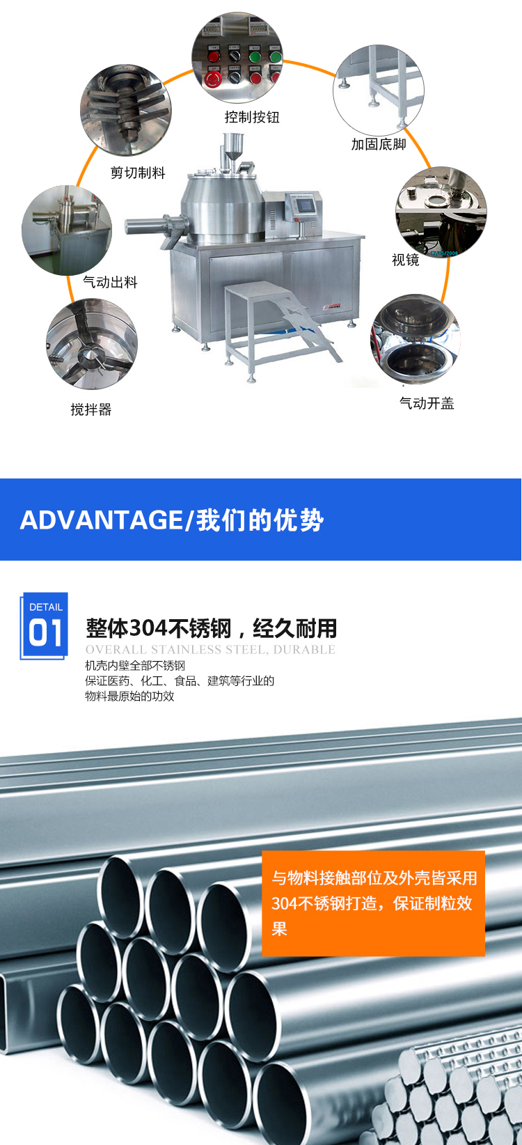 本機(jī)采用臥式圓筒構(gòu)造,結(jié)構(gòu)合理。充氣密封驅(qū)動(dòng)軸,清洗時(shí)可切換成水。流態(tài)化造粒,成粒近似球形,流動(dòng)性好。較傳統(tǒng)工藝減少25%粘合劑,干燥時(shí)間縮短。每次干混2分鐘,造粒1—4分鐘,功效比傳統(tǒng)工藝提高4—5倍。在同一封閉容器內(nèi)完成,干混—濕混—制粒,工藝縮減,符合GMP規(guī)范。整個(gè)操作具有嚴(yán)格的安全保護(hù)措施。