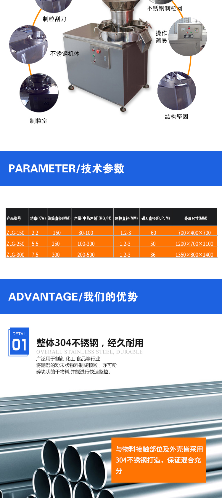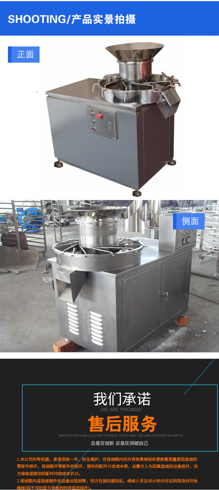 本機(jī)廣泛于制藥.化工.食品等行業(yè).將潮濕的粉末狀物料制成顆粒,亦可粉碎塊狀的干物料,并能進(jìn)行快速整粒。該機(jī)是一種將潮濕粉末混合物,在旋轉(zhuǎn)滾筒的正,反旋轉(zhuǎn)作用下,強(qiáng)制性通過篩網(wǎng)而制成顆粒的專用設(shè)備.該設(shè)備為本公司超近開發(fā)的一種新型設(shè)備,其優(yōu)點(diǎn)是自動(dòng)卸料,效率為YK-160搖擺制粒機(jī)的2-3倍,并滿足GMP標(biāo)準(zhǔn),是理想的制粒設(shè)備之一。結(jié)構(gòu)簡單、易操作、移動(dòng)方便。自動(dòng)卸料,彌補(bǔ)了老產(chǎn)品手工卸料的缺點(diǎn)。可連續(xù)操作。適用于半干狀態(tài)的粉料和帶有一定粘性的物料、中藥沖劑、食品類固體飲料、雞精等。