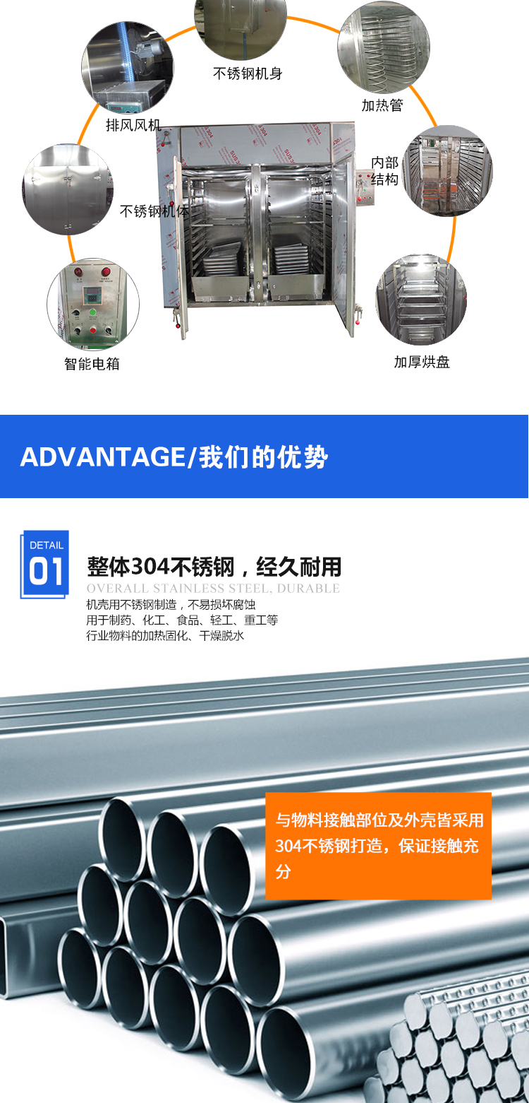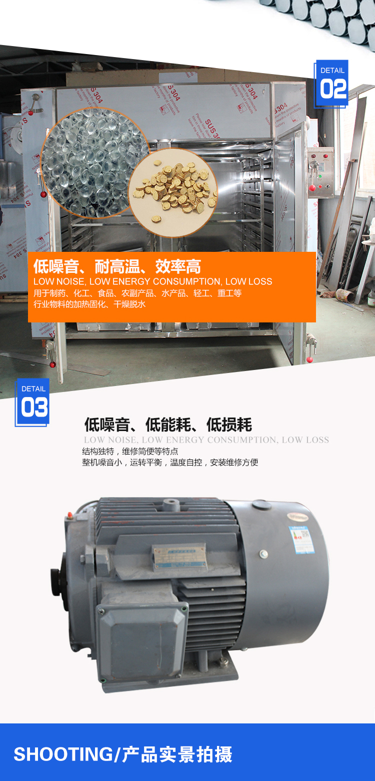 用于制藥、化工、食品、農(nóng)副產(chǎn)品、水產(chǎn)品、輕工、重工等行業(yè)物料的加熱固化、干燥脫水。如原料藥、生藥、中藥飲片、浸膏、粉劑、顆粒、沖劑、水丸、包裝瓶、顏料、染料、脫水蔬菜、瓜果干、香腸、塑料樹脂、電器原件、烘漆等。