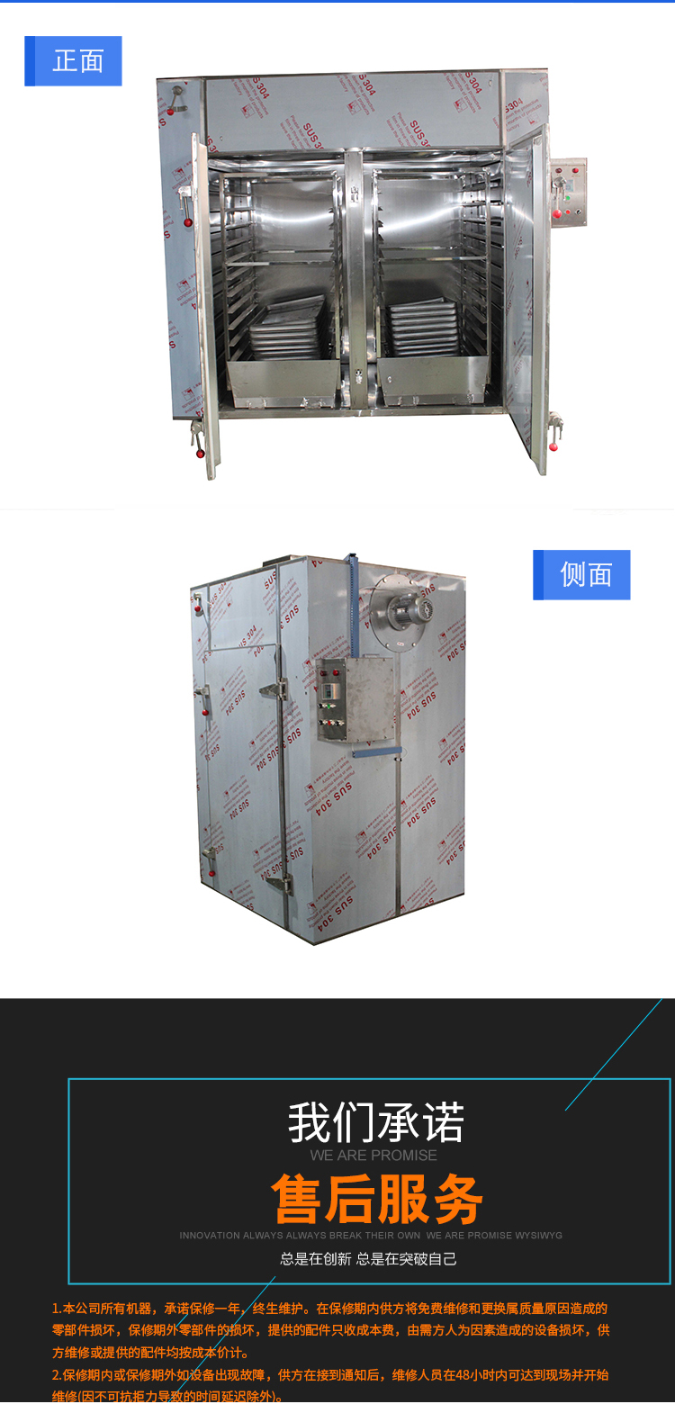 3.利用強(qiáng)制通風(fēng)作用,箱內(nèi)設(shè)有可調(diào)式分風(fēng)板,物料干燥均勻。
