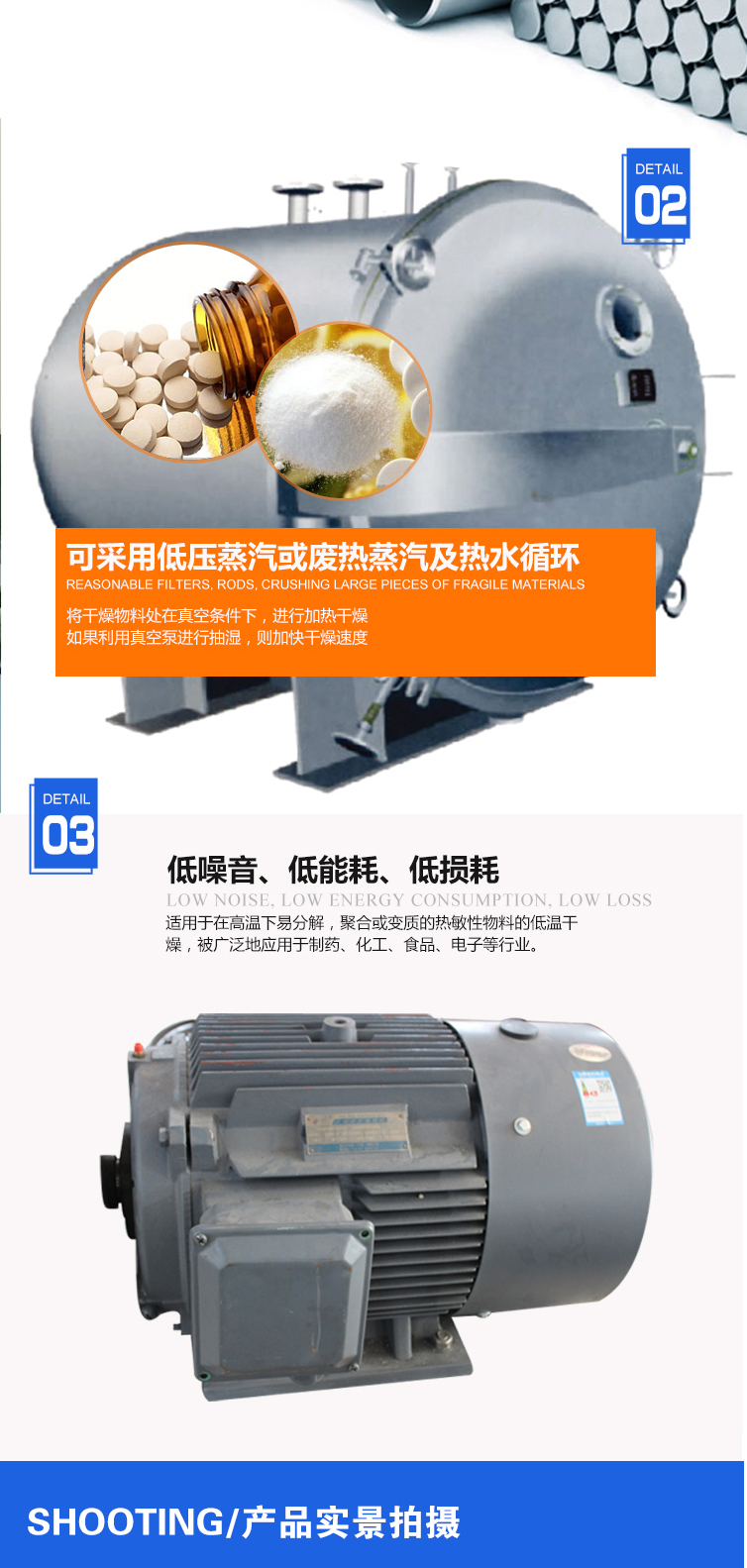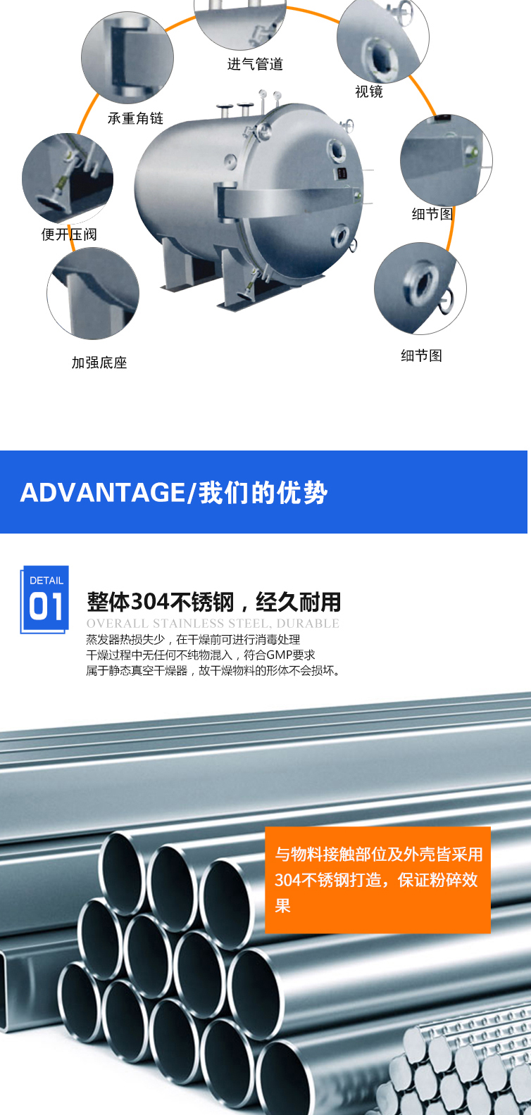 真空下物料溶液的沸點降低,使蒸發(fā)的傳熱推動力增大,因此對一定的傳熱量可以節(jié)省蒸發(fā)器的傳熱面積。蒸發(fā)操作的熱源可采用低壓蒸汽或廢熱蒸汽及熱水循環(huán)。蒸發(fā)器熱損失少,在干燥前可進行消毒處理,干燥過程中無任何不純物混入,符合GMP要求。屬于靜態(tài)真空干燥器,故干燥物料的形體不會損壞。