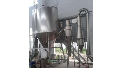 空氣經(jīng)過(guò)濾和加熱,進(jìn)入干燥器頂部空氣分配器,熱空氣呈螺旋狀均勻地進(jìn)入干燥室。料液經(jīng)塔體頂部的高速離心霧化器,旋轉(zhuǎn)噴霧成極細(xì)微的霧狀液珠,與熱空氣并流接觸在極短的時(shí)間內(nèi)可干燥為成品。成品由干燥塔底部和旋風(fēng)分離器中輸出,廢氣由風(fēng)機(jī)排空。