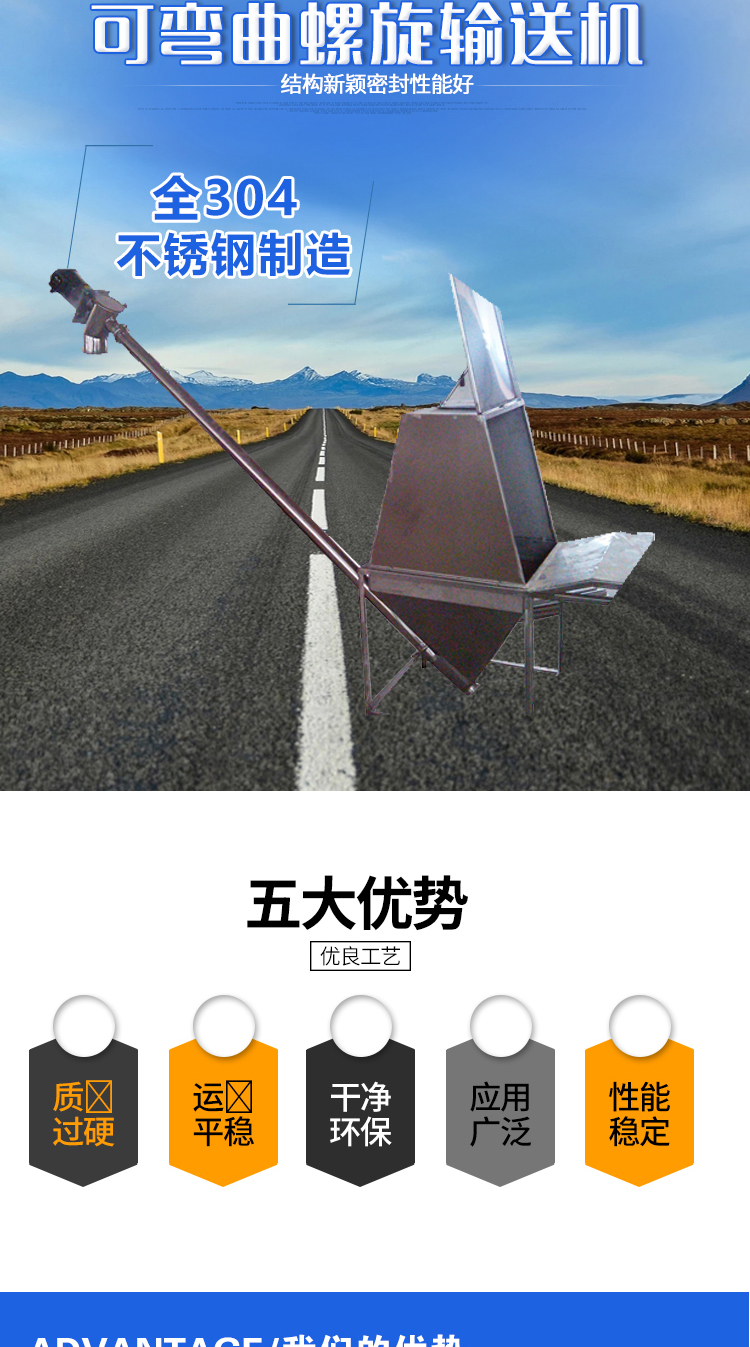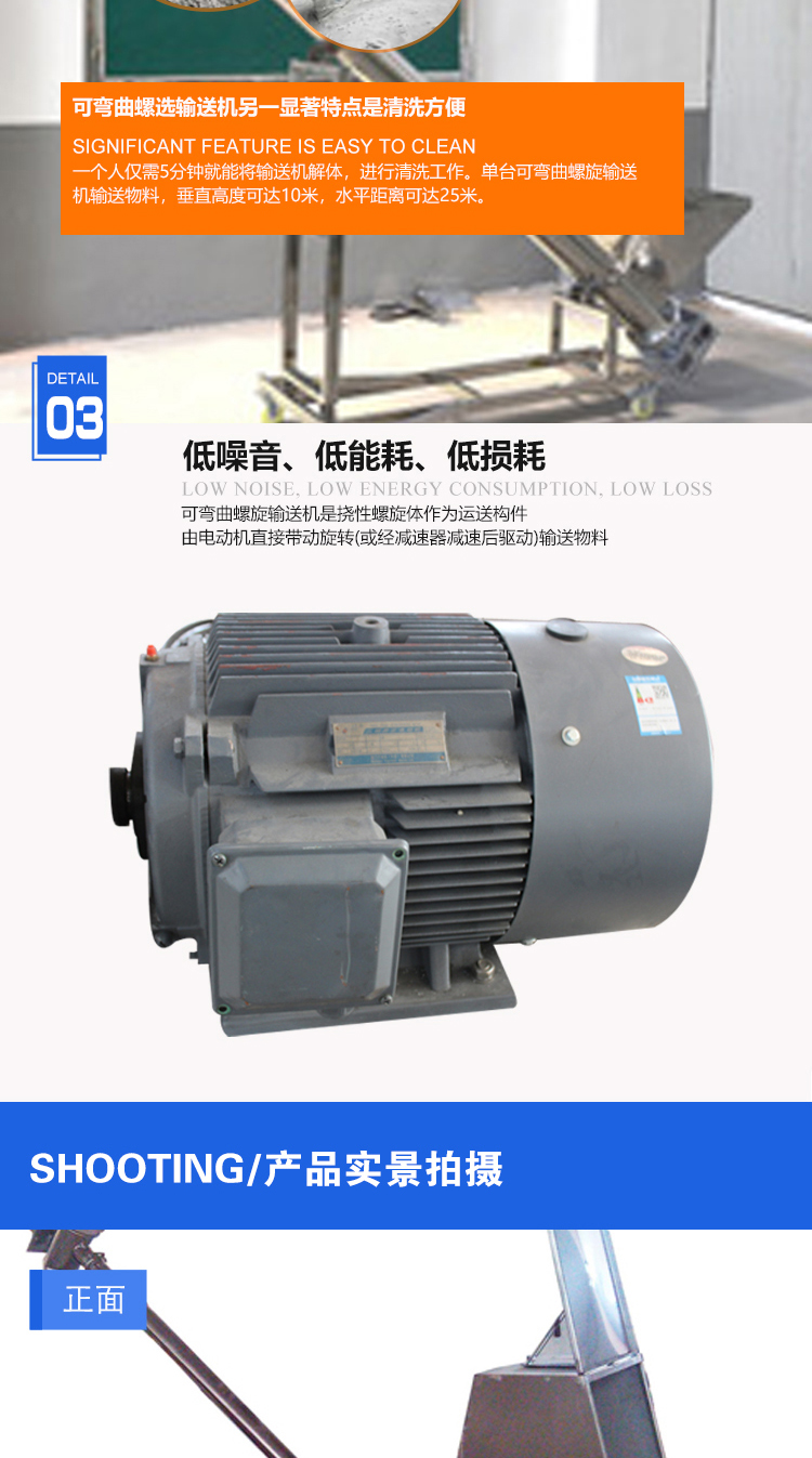 可彎曲螺旋輸送機是撓性螺旋體作為運送構(gòu)件,由電動機直接帶動旋轉(zhuǎn)(或經(jīng)減速器減速后驅(qū)動)輸送物料,適用于輸送各種粉狀、顆粒狀、球狀、片狀等物料。該螺旋輸送機可以作直線輸送,也可以彎曲輸送,這種高度靈活性讓使用者非常方便地不止各種設(shè)備。撓性螺旋體是該輸送機的運動部件,無論做多遠距離輸送,輸送管中沒有軸承等其它運動部件,因此該輸送機性能可靠,幾乎不需要維修,不會發(fā)生潤滑油污染輸送物料這類問題??蓮澢葸x輸送機另一顯著特點是清洗方便,一個人僅需5分鐘就能將輸送機解體,進行清洗工作。單臺可彎曲螺旋輸送機輸送物料,垂直高度可達10米,水平距離可達25米。如將多臺輸送機串聯(lián)起來,則可輸送更遠、更高距離。螺旋輸送機主要用于輸送粉狀顆粒狀和小塊狀物料,如煤粉、爐灰、水泥、化肥、純堿、砂糖、谷物等;螺旋輸送機/螺旋給料機結(jié)構(gòu)新穎密封性能好,可在若干位置進行中間加載和多點加載,操作安全,方便可靠.螺旋式輸送機/螺旋給料機是在化工建材糧食等部門中廣泛應(yīng)用的一種輸送設(shè)備.